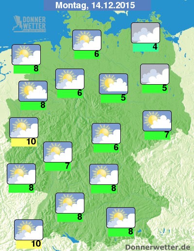 Heute bleiben die Wolken vor allem im Nordosten Deutschlands häufig dicht, sonst gibt es jedoch meist einen Wechsel aus einigen Wolken und zeitweiligem Sonnenschein. Am Nachmittag kann sich die Sonne vor allem im Süden und Südwesten oft durchsetzen und es wird vielerorts auch sonnig. Es bleibt landesweit trocken bei Temperaturen von 4 Grad in Vorpommern und bis 10 Grad im Breisgau.