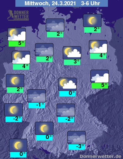 In der Nacht zum Mittwoch bleibt es im Osten und im Nordseeumfeld überwiegend stark bewölkt. Im übrigen Land ist es schon meist aufgelockert bewölkt und es lockert und klart verbreitet noch weiter auf. Es bleibt landesweit trocken bei Tiefstwerten von 5 Grad in Dresden und bis -3 Grad in Augsburg.