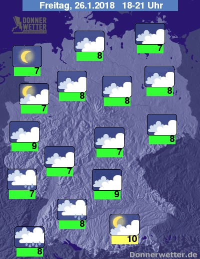 Heute Abend fällt in einem breiten Streifen vom Südwesten bis zur Mitte Deutschlands gebietsweise Regen, auch sonst bleibt es im Land weitgehend wolkenverhangen, dabei jedoch trocken. Oft nur locker bewölkt oder sternenklar zeigt sich das Nordseeumfeld und auch der Südosten der Republik. Die Temperatur liegt bei milden 7 bis 10 Grad.