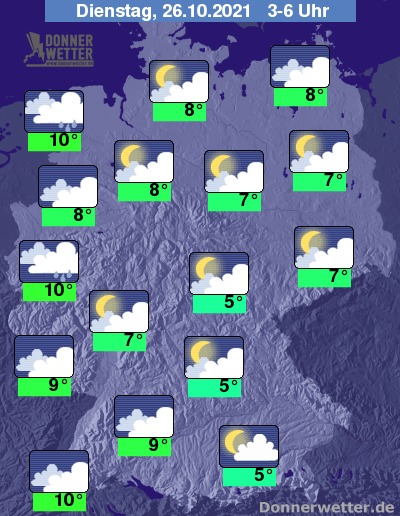In der kommenden Nacht ziehen im Nordwesten und Westen Deutschlands teils kompakte Wolken mit einzelnen Schauern durch. Im übrigen Land ist es aufgelockert oder stark bewölkt, dazu bleibt es trocken. Die Temperatur sinkt auf 10 Grad am Rhein und bis 5 Grad in Oberbayern.