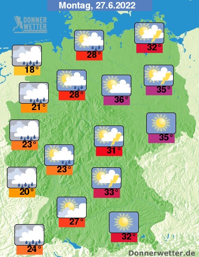 Am Montag ist es nach Osten hin verbreitet heiter bis sonnig, hier besteht im Tagesverlauf ein leichtes Schauer- und Gewitterrisiko. Im übrigen Land ist es überwiegend stark bewölkt, dabei bilden sich vielerorts Schauer und örtliche Gewitter. Die Temperatur steigt auf 18 Grad an der Nordsee und bis zu 36 Grad in Magdeburg.