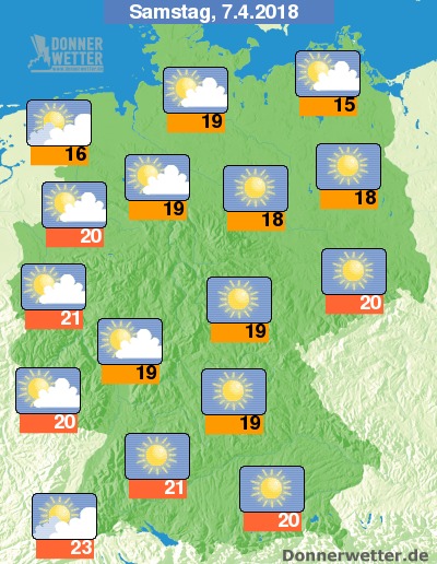 Am Samstag strahlt wieder über dem gesamten Bundesgebiet die Sonne und es ziehen nur hier und da lockere Wolkenfelder durch, dabei bleibt es trocken. Die Temperatur steigt auf frühlingshafte 15 Grad an der Ostsee und auf frühsommerliche 23 Grad im Breisgau.