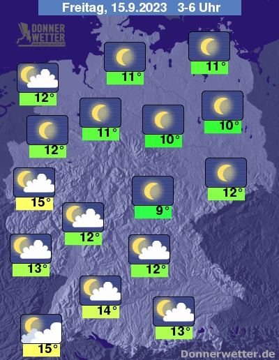 In der bevorstehenden Nacht ist der Himmel über der Nordosthälfte verbreitet sternenklar. Im Süden und Westen zieht aber oft leichte bis wechselnde Bewölkung durch. Bei Tiefstwerten von 15 Grad im Oberrheingraben und 9 Grad im Grabfeld bleibt es überall trocken.