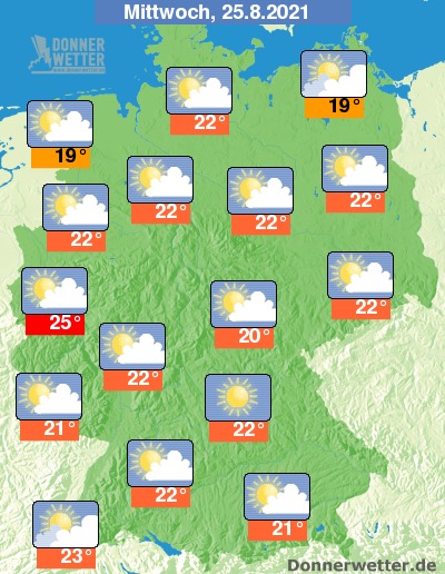 Am Mittwoch ist es verbreitet heiter oder sonnig, allerdings ziehen im Norden oft viele und zum Teil dichte Wolken durch, hier ist zudem etwas Regen möglich, während es im übrigen Land trocken bleibt. Die Temperatur erreicht 19 Grad in Stralsund und bis 25 Grad in Köln.