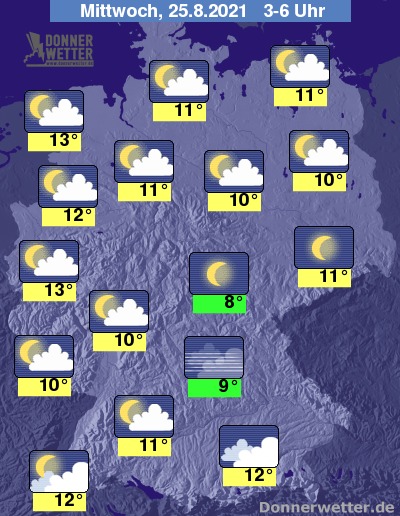 In der folgenden Nacht zeigt sich der Himmel über der Republik überwiegend locker bewölkt und teils sternenklar. Im Küstenumfeld und an den Alpen halten sich auch oft dichte Wolken, es bleibt aber trocken. Die Temperatur sinkt auf 13 Grad an der Ems und bis 8 Grad im Vogtland.