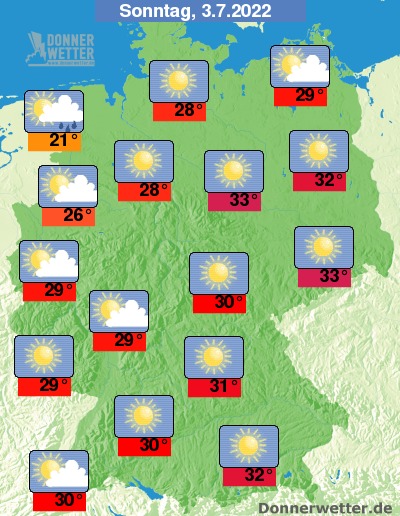 Am Sonntag ist es überwiegend heiter bis sonnig, gebietsweise ziehen auch ein paar Wolken durch. Im Nordwesten bilden sich dazu örtlich auch Schauer oder Gewitter, während es sonst weitgehend trocken bleibt. Die Temperatur erreicht 21 Grad an der Nordsee und bis 33 Grad in der Lausitz.