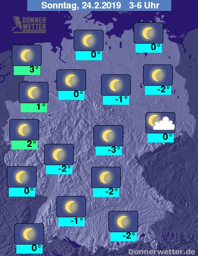 In der folgenden Nacht zeigt sich der Himmel verbreitet sternenklar und lockere Wolken bleiben eher selten, dazu bleibt es trocken. Die Temperatur sinkt auf 3 Grad im nördlichen Emsland und bis -3 Grad im Eichsfeld.