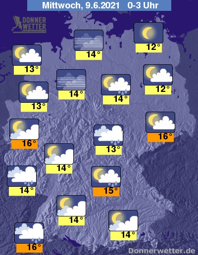 In der Nacht bleibt der Himmel über der West- und Nordwesthälfte sowie im Osten meist locker bewölkt, im Nordosten funkeln die Sterne auch von einem wolkenlosen Himmel. Es bleibt meist trocken.