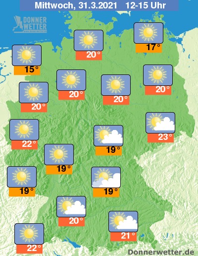 Heute Nachmittag zeigt sich das Wetter verbreitet sonnig, vor allem im Osten und Südosten ist es jedoch gebietsweise auch leicht bis wechselnd bewölkt, dabei bleibt es trocken. Die Temperatur liegt bei 15 Grad an der Nordsee und bis 22 Grad entlang des Rheins.