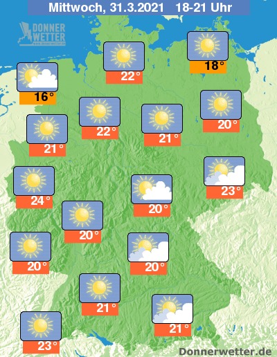 Heute Abend ist es von Bayern bis nach Sachsen gebietsweise locker bis aufgelockert bewölkt. Im großes Rest des Landes ist es jedoch verbreitet sonnig oder es ziehen nur wenige Wolken durch, dazu bleibt es überall trocken. Die Temperatur liegt bei meist frühsommerlichen 20 bis 24 Grad, lediglich an den Küsten ist es mit 16 bis 20 Grad kühler.