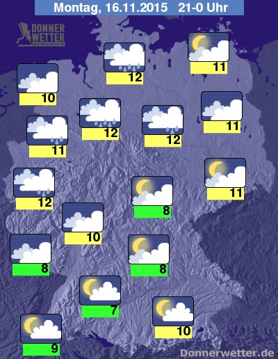 In der ersten Nachthälfte erreichen Schauergebiete dann auch das Rheinland und den Norden Sachsen-Anhalts. Die Temperaturen sinken auf Werte um 12 Grad C in den Regengebieten und um 7 Grad C am Bodensee.