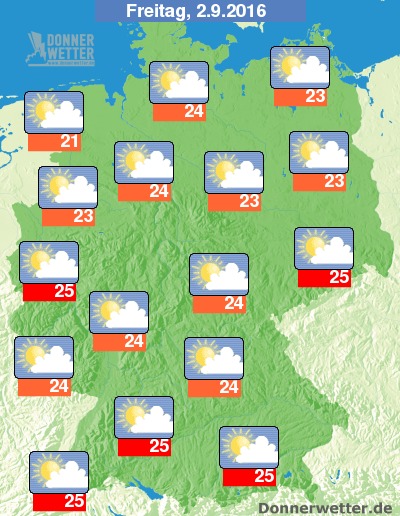 Am Freitag gibt es zumeist einen Mix aus Sonne und Wolken, vor allem im Süden und Osten ist es oft nur gering bewölkt, in den übrigen Landesteilen gebietsweise auch noch aufgelockert bewölkt, dabei bleibt es überall trocken. Die Temperatur steigt auf 21 Grad an der Nordseeküste und bis 25 Grad im Breisgau.