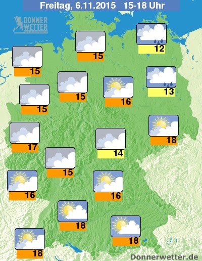 Am Nachmittag befinden sich heitere Abschnitte des Landes überwiegend im Süden. Bewölkt zeigt der Himmel sich im Nordwesten der Republik. An der Ostseeküste ist mit teilweise schweren Regenfällen zu rechnen. Die Temperaturen liegen bei Werten von 12 Grad C bis zu 18 Grad C.