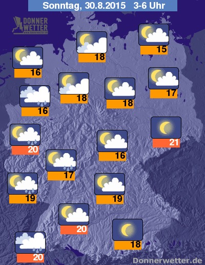 In der Nacht zum Sonntag ziehen vom Nordwesten, über den Westen bis in den Südwesten des Landes zeitweise dichte Wolken durch, dabei sind vielerorts Schauer und auch teils kräftige Gewitter möglich. Über die Osthälfte der Republik zieht hingegen meist lockere oder aufgelockerte Bewölkung durch und es bleibt trocken. Im Südosten Deutschlands sowie in Sachsen bleibt der Himmel größtenteils sogar sternenklar. Die Temperatur sinkt auf tropische 21 Grad in Dresden und bis 16 Grad entlang der Ems.