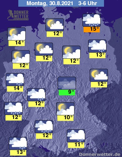 In der Nacht zum Montag fällt zunächst vor allem im Süden und Westen weiterer Regen, sonst ist es oft stark, teils auch aufgelockert bewölkt und zunächst meist trocken. Im Laufe der Nacht zieht von der Ostsee her aus Nordosten zum Teil kräftiger Regen herein. In einem Streifen vom Niederrhein bis ins nördliche Bayern bleibt es aber weitgehend trocken. Die Temperatur sinkt auf 15 Grad in Stralsund und bis 9 Grad in Jena.