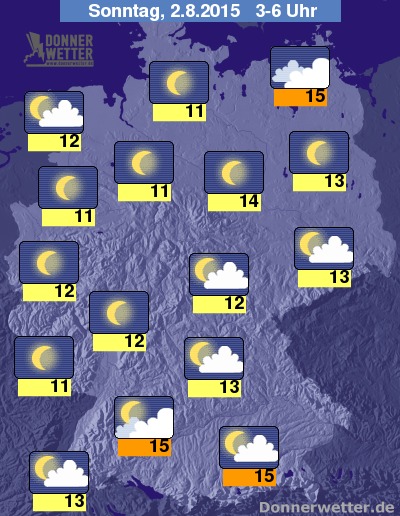 In der Nacht zum Sonntag ist es im Süden und im Nordosten Deutschlands meist stark, teils auch aufgelockert bewölkt. Im übrigen Bundesgebiet ist es dagegen meistens sternenklar, hier und da aber auch locker bewölkt. Es bleibt überall trocken und die Temperatur sinkt auf 15 Grad in Wismar und bis 11 Grad in Ostwestfalen.