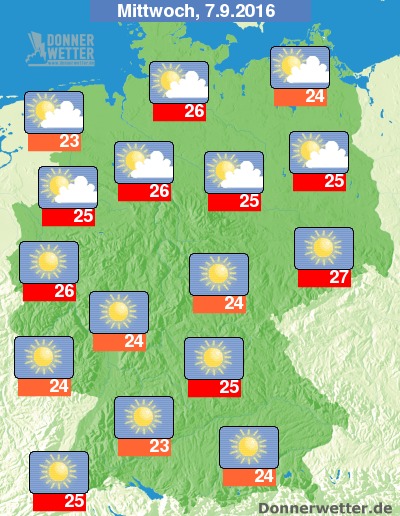 Am Mittwoch bleibt es von der breiten Landesmitte bis in den Süden hinein weitgehend sonnig und auch trocken. Teils lockere Wolken ziehen jedoch über den Norden hinweg, jedoch bleibt es auch hier trocken. Es werden 23 Grad am Bodensee und bis etwa 27 Grad in der Lausitz erreicht.