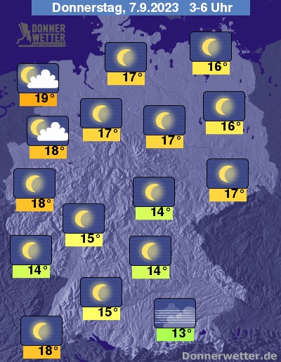 In der Nacht sind im Nordwesten des Landes ein paar lockere Wolkenfelder möglich. Im großen Rest der Republik zeigt sich der Himmel aber weitgehend sternenklar. Bei Tiefstwerten von 19 Grad in Wilhelmshaven und 13 Grad in Augsburg bleibt es überall trocken.