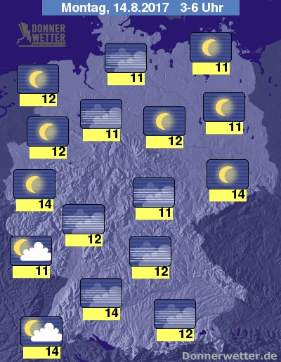 In der kommenden Nacht zeigt sich der Himmel über dem Land meist sternenklar, lockere Wolken sind vor allem entlang des Oberrheins möglich. Es bleibt überall trocken bei Tiefstwerten zwischen 14 Grad in Freiburg und etwa 11 Grad an der Müritz.