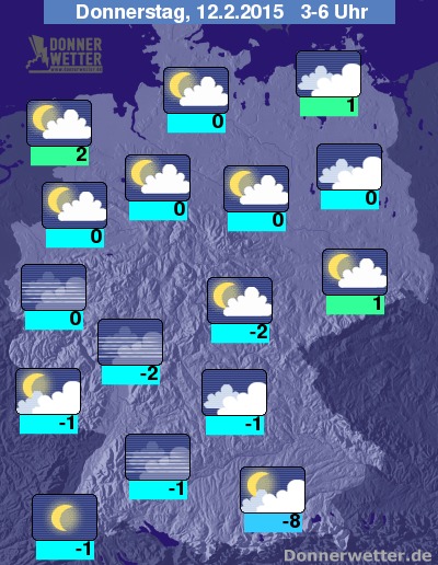 Am Donnerstag wird es in weiten Landesteilen der Bundesrepublik heiter oder sonnig und es bleibt dazu trocken. Im Süden und Südosten des Landes hält sich gebietsweise jedoch noch hochnebelartige Bewölkung, auch im äußeren Norden ist es oft noch trüb, allerdings ebenfalls trocken. Die Temperatur steigt auf 3 Grad im Südosten und bis etwa 8 Grad in der Kölner Bucht.