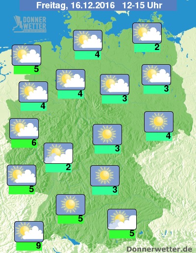 Die Höchstwerte liegen zwischen 2 Grad an der Ostsee und 9 Grad am Oberrhein.