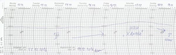 Am Sonntag machte sich dann bereits tieferer Luftdruck bemerkbar, wie auch der Luftdruckschrieb unserer Wetterstation in Bonn zeigt (Zeitraum 12.12. - 19.12.2016):