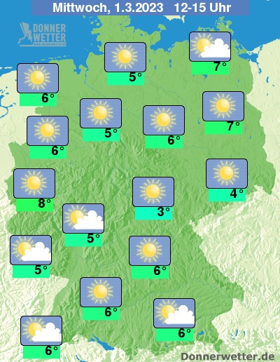 Heute Nachmittag scheint über dem Land verbreitet die Sonne und es können nur lockere Wolkenfelder durchziehen. Bei 3 Grad im Grabfeld und etwa 8 Grad im Rheinland bleibt es landesweit trocken.