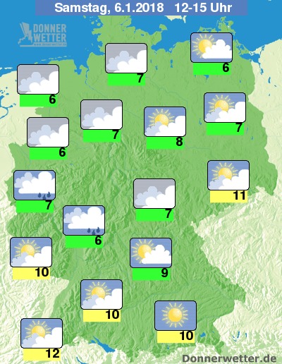 Heute Nachmittag zeigt sich besonders im Süden häufig die Sonne zwischen oft nur lockeren Wolken, jedoch ist es auch im Osten oft aufgelockert bewölkt, dazu bleibt es hier trocken. Im übrigen Bundesgebiet hält sich zumeist dichte Bewölkung aus der im Südwesten und Westen des Landes gebietsweise Regen fällt, sonst bleibt es aber trocken. Die Temperatur liegt bei 6 bis 12 Grad.