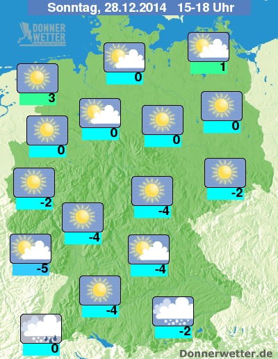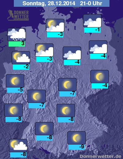 Am Abend reißt auch der Himmel im Süden Deutschlands verbreitet auf, dabei kann sich stellneweise Nebel bilden. Auch weiter nördlich ist der Himmel oft sternenklar oder nur locker bewölkt, dabei bleibt es ebenfalls trocken. Oft dichte Wolken ziehen hingegen über den Norden Deutschlands hinweg, dazu kann im Umfeld der Nordsee auch zeitweise Schnee, Schneeregen oder Regen fallen. Die Abendtemperatur liegt bei 3 Grad an der Nordsee und etwa -9 Grad am Alpenrand.