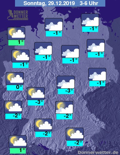 In der folgenden Nacht zieht es sich über der Nordosthälfte weitgehend zu, sonst bleibt es oft locker bis aufgelockert und nur hier und da auch stark bewölkt. Es bleibt landesweit trocken bei Tiefstwerten von 1 Grad an der Nordsee und bis -3 Grad am Thüringer Wald.