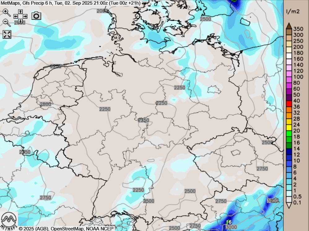 Die Strömungs- und Temperaturkarte für Dienstagnachmittag (15:00 Uhr) sowie die Sechs-Stunden-Regenmengen bis 21:00 Uhr nach GFS.