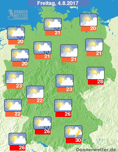 Hinter der Kaltfront des nach Südnorwegen ziehenden Tiefs gelangt etwas kühlere Atlantikluft in große Teile unseres Landes. Lediglich im Süden hält sich dank des Azorenhochkeils zunächst noch die sehr warme und schwüle Subtropikluft. Hinter einer weiteren Störung, die uns am Wochenende von Westen überquert wird diese allerdings bis Sonntag auch hier verdrängt.