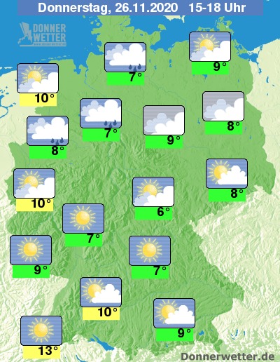 Am frühen Nachmittag halten sich in Norddeutschland häufig dichtere Wolken aus denen es stellenweise etwas tröpfeln oder nieseln kann. In der Mitte und im Süden gibt es eine Mischung aus teils dichtem Nebel oder Hochnebel und regionalem Sonnenschein.