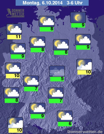 In der kommenden Nacht lockert auch die Bewölkung im Westen wieder auf und auch in den übrigen Regionen bleibt der Himmel verbreitet aufgelockert bewölkt, gebietsweise ist es auch nur leicht bewölkt, im Nordosten auch zeitweise sternenklar. Dabei bleibt es trocken. Es bildet sich stellenweise Nebel oder Dunst. Die Temperatur sinkt auf 11 Grad in Wilhelmshaven und bis 5 Grad im Grabfeld.