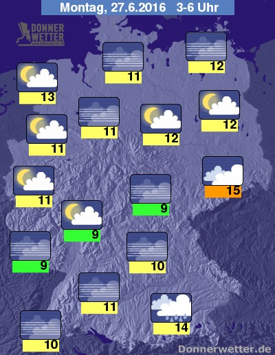 In der folgenden Nacht fällt im Südosten bei dichten Wolken weiterer Regen. Im übrigen Land ist der Himmel verbreitet nur leicht bewölkt oder sternenklar. Im Osten ist es hingegen meist stark bewölkt, aber ebenfalls trocken. Die Temperatur sinkt auf 15 Grad in Dresden und etwa 9 Grad am Hunsrück.