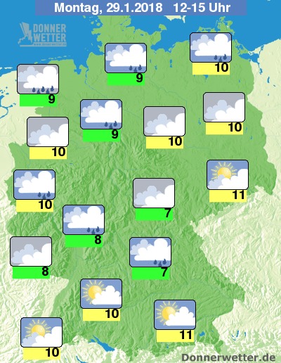 Heute Nachmittag kann sich südlich des Mains häufig die Sonne zeigen, hier bleibt es weitgehend trocken. Im großen Rest der Republik bleibt es hingegen verbreitet trüb oder stark bewölkt und es fällt zeitweise, zum Teil auch kräftiger Regen. Die Temperatur liegt bei 7 bis 11 Grad.