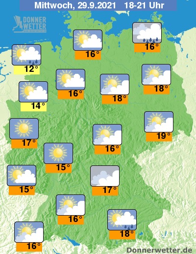 Heute Abend hält sich im Süden und Osten noch meist starke Bewölkung, wobei einzelne Schauer möglich sind. Im großes Rest der Republik heitert es verbreitet auf und es bleibt trocken. Die Temperatur liegt bei 12 Grad in Cuxhaven und etwa 19 Grad in Dresden.