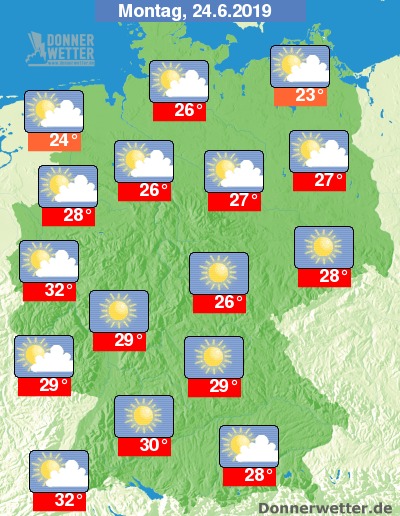 Heute erwartet uns ein verbreitet sonniger und trockener Sommertag. An den Küsten ziehen hier und da, im übrigen Bundesgebiet nur selten lockere Wolken durch. Die Temperatur steigt auf 23 Grad in Rostock und bis auf heiße 32 Grad in Düsseldorf.