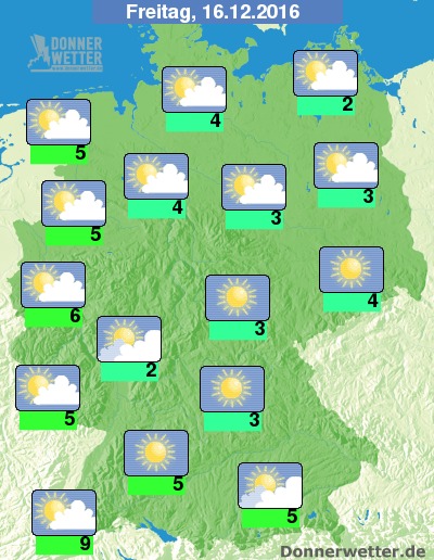 Nach einem frostigen Start in den Tag mit Temperaturen um den Gefrierpunkt steigt das Quecksilber im Tagesverlauf auf maximal 2 Grad an der Ostsee und 9 Grad am Oberrhein.