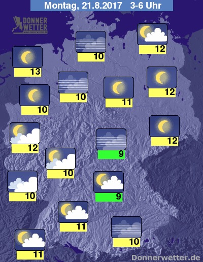 In der Nacht zum Montag ziehen im Nordosten zunächst noch einige, teils dichtere Wolken durch, im weiteren Verlauf lockert und klart der Himmel hier, wie schon im übrigen Bundesgebiet verbreitet auf. Von Südwesten nimmt die Bewölkung zum Morgen hin jedoch wieder zu. Es bleibt landesweit trocken bei Tiefstwerten zwischen 13 Grad in Wilhelmshaven und etwa 9 Grad im Grabfeld.