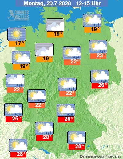 Heute Nachmittag zeigen sich immer mehr heitere bis sonnige Abschnitte. Besonders von der Mitte des Landes bis nach Ostdeutschland und auch in den Nordosten halten sich oft auch dichte Wolken, die hier für Schauer und mögliche Gewitter sorgen, sonst werden Schauer und vereinzelte Gewitter imme seltener. Die Temperatur liegt bei 17 Grad an der Nordsee und bis 28 Grad in Stuttgart und München.
