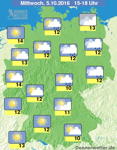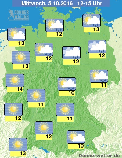 Die Temperaturen liegen unter der 15-Grad-Linie. Die Tiefsttemperatur finden wir in Bayern bei um die 10 Grad C und die Höchsttemperatur mit um die 14 Grad C im Rheinland.