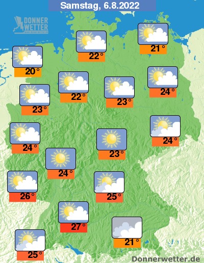 Am Samstag ist es im Südosten stark bewölkt und es bilden sich hier weiterhin einzelne Schauer, örtlich auch Gewitter. Im großes Rest des Landes wird es verbreitet heiter bis sonnig und dazu trocken. Die Temperatur erreicht 20 Grad in Cuxhaven und bis 27 Grad in Stuttgart.