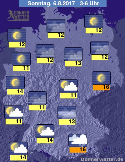 In der kommenden Nacht halten sich am Alpenrand und am Bayerischen Wald oft dichte Wolken, dazu bilden sich hier Schauer und auch örtliche Gewitter, sonst zeigt sich der Himmel über dem Land zum Großteil sternenklar oder locker bewölkt, dabei bleibt es trocken. Die Temperatur sinkt auf 16 Grad in Dresden und bis 11 Grad im Eichsfeld.