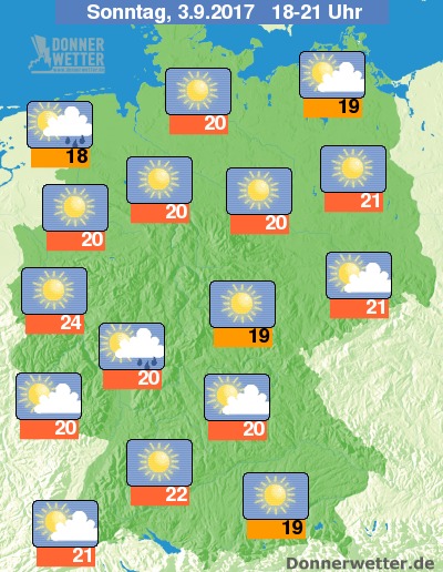 Heute Abend ist es fast landesweit nur heiter bis sonnig, nur selten ziehen auch mal dichtere Wolken mit etwas Regen durch, sonst bleibt es trocken bei Temperaturen von 18 Grad in Cuxhaven und bis 24 Grad in Köln.
