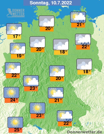 Am Sonntag ist es im Süden heiter bis sonnig und weitgehend trocken. Im übrigen Bundesgebiet ist es zum Teil heiter, teils ist es stark bewölkt, dabei bleibt es weitgehend trocken. Die Temperatur erreicht 17 Grad im nördlichen Emsland und bis 25 Grad am Oberrhein.