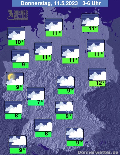 In der Nacht zum Donnerstag fällt unter dichten Wolken vom Südosten, über den Osten bis in den Nordosten gebietsweise Regen. In den westlichen Landesteilen ist es zum Teil wechselnd bis aufgelockert bewölkt, im übrigen Land dagegen meist dicht bewölkt, jedoch weitgehend trocken. Die Temperatur sinkt auf 12 Grad in Dresden und 7 Grad in Wiesbaden.