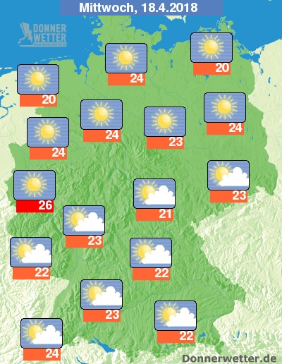Am Mittwoch erwartet uns ein verbreitet sonniger und trockener Tag. Lockere Wolken können noch über die Südhälfte des Landes ziehen, dabei bleibt es trocken. Die Temperatur steigt auf rund 20 Grad an den Küsten von Nord- und Ostsee und bis 26 Grad im Rheinland.