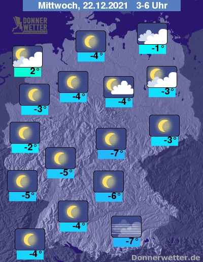 In der folgenden Nacht ist der Himmel verbreitet sternenklar. Mehr und zum Teil auch dichte Wolken halten sich im Norden und vor allem im Küstenumfeld, hier sind auch wenige Flocken oder Tropfen möglich, sonst bleibt es trocken. Die Temperatur sinkt auf 2 Grad an der Nordsee und bis -7 Grad im Berchtesgadener Land.