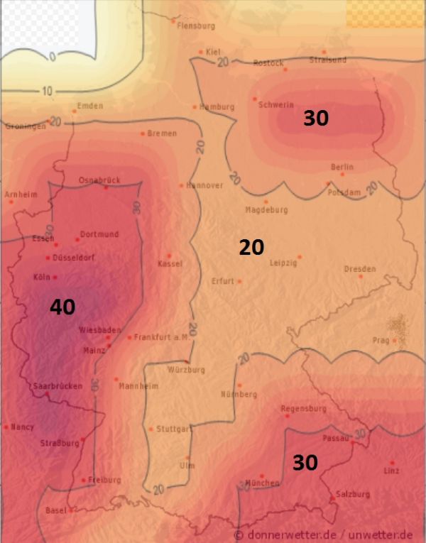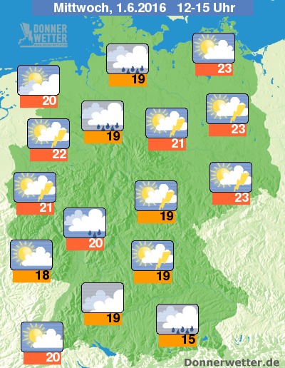 Heute Nachmittag ziehen immer wieder viele und oft auch dichte Wolken über uns hinweg, zwischendurch zeigt sich auch die Sonne. Es bilden sich besonders über dem Norden lokal schwere Gewitter mit Starkregen, Hagel und möglichen Sturmböen. Im Alpenvorland fällt häufig Regen. Die Temperatur liegt bei nasskühlen 15 Grad in Rosenheim und bei schwülwarmen 23 Grad in der Lausitz.